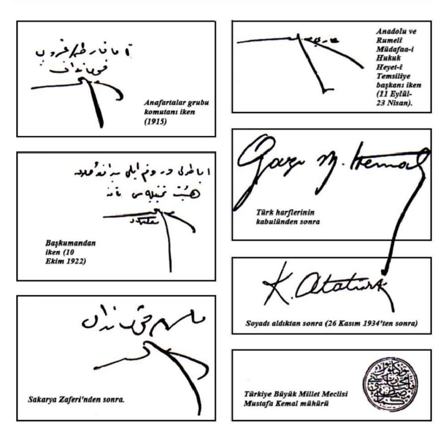 7. Atatürk’ün çeşitli imzaları vardır. Bu imzalardaki değişikliklerin nedeni Mustafa olan ismine sonradan Kemal’in eklenmesi; Atatürk soyadını alması ve Gazi unvanını alması. Mustafa, imzayı çok uzattığı için M. olarak kısaltılmış, daha sonradan Gazi ve Atatürk’ün eklenmesi nedenleri ile ise imzada kimi ifadeleri kullanmamıştır.
